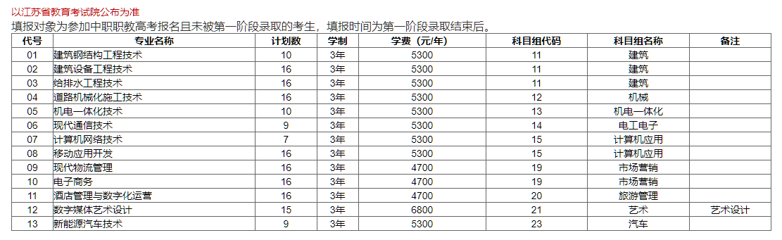 2022年江苏省江苏建筑职业技术学院中职职教高考专科第二批次(原注册入学)计划(院校代码:1230)