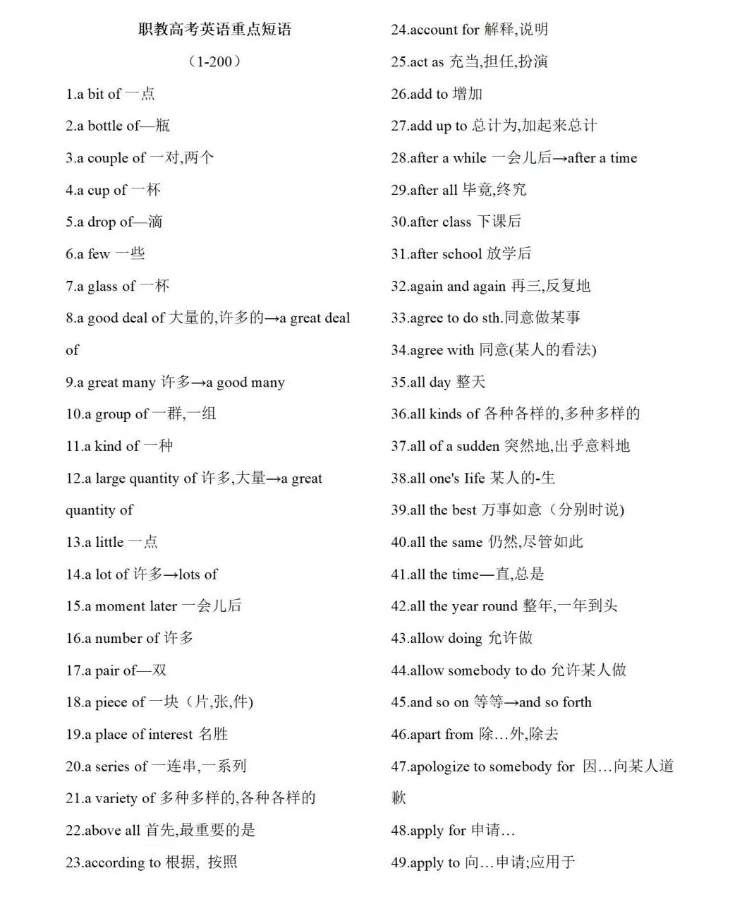 江苏职教高考网为大家分享2024年江苏职教高考复习备考英语重点短语,一共200个重点短语,希望能帮助准备报考的同学更好的复习英语科目,欢迎阅读。